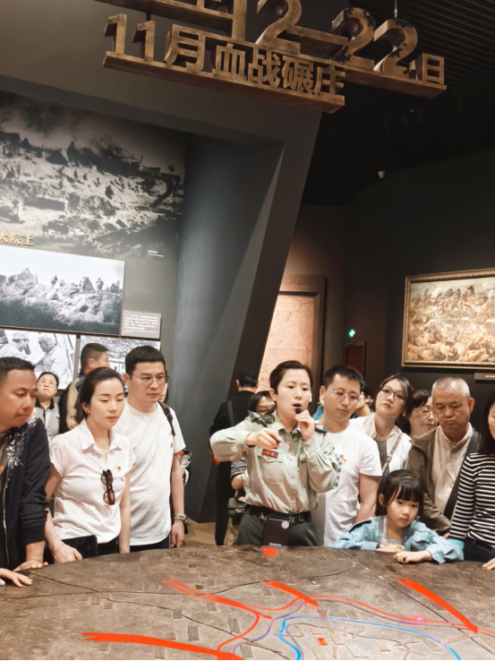 离开烈士纪念塔,党员们走进淮海战役纪念馆。馆内丰富的历史文物、珍贵的影像资料、逼真的场景复原,全方位、多角度地再现了淮海战役的全过程。党员们跟随讲解员的步伐,认真聆听那段艰苦卓绝的战斗历程。从战役的战略决策、激烈的战斗场景,到人民群众的踊跃支前,每一个细节都深深触动着大家的心弦。在陈列的武器装备、烈士遗物前,党员们驻足良久。锈迹斑斑的枪支、布满补丁的军装、字迹模糊的家书,这些承载着历史记忆的物品,让党员们真切感受到了革命先烈们在战争年代所经历的艰难困苦与顽强不屈。尤其是看到人民群众推着独轮车支援前线的场景复原时,党员们深刻体会到了 “淮海战役的胜利是人民群众用小车推出来的” 这句话的深刻内涵,更加坚定了“一切为了人民,一切依靠人民”的宗旨意识。