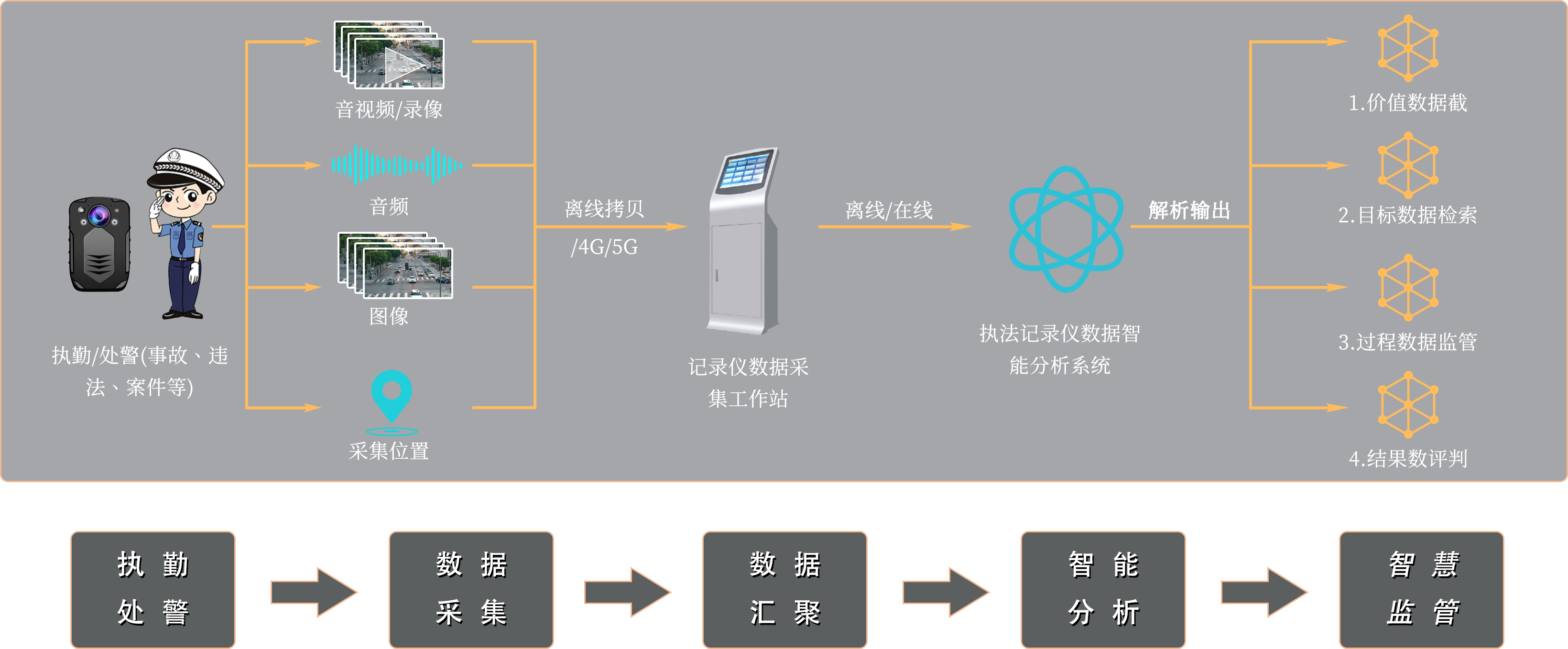 执法仪数据智能标注系统,是将AI技术赋能于交警的执勤/处警业务。系统通过对执法过程中执法记录仪采集到的音视频/录像/图像/位置信息等数据,通过计算机视觉、NLP、数据碰撞等技术,实现对数据的智能分析监管,优化各部门对执法数据的便捷化应用。